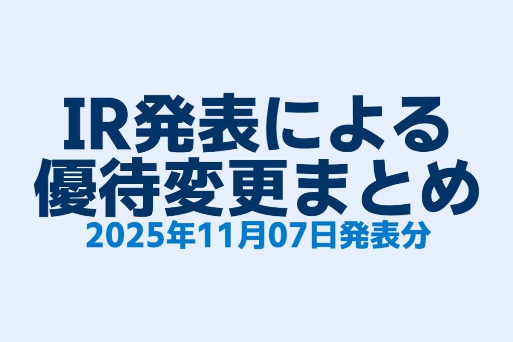 適時開示資料からチョイスした各社の株主優待の新設・廃止・拡充・縮小の情報をお届けします。今回紹介するのは 2025年11月7日に開示された内容です! セントケアHD、ビーエンジが株主優待を廃止 セントケア・ホールディング株式会社(セントケアHD)... -