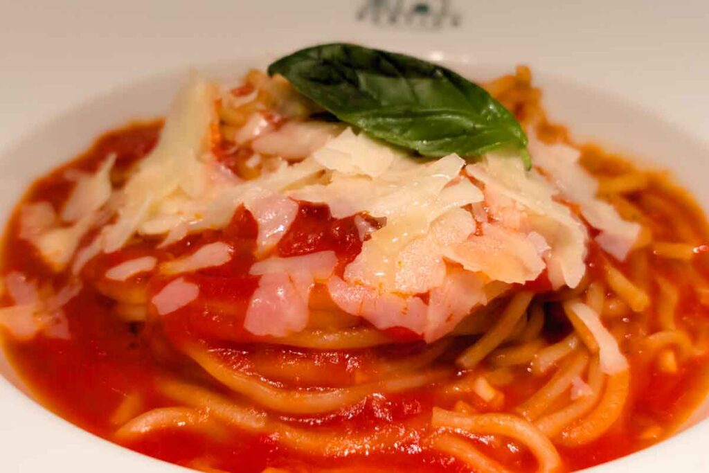 冒頭の写真で紹介した「イタリア産トマトを使った完熟トマトソースのパスタ」の他に、「生ハムとロメインレタスのペペロンチーノ」を注文しました。