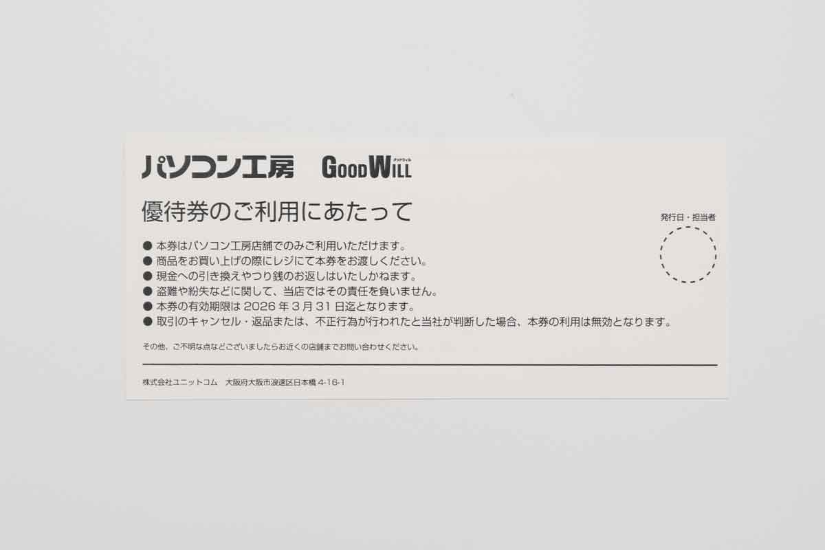 「パソコン工房」1万円商品券の注意点としては店舗でしか使えないことと、2025年8月に届きましたが有効期限は約半年の2026年3月末までという点です。